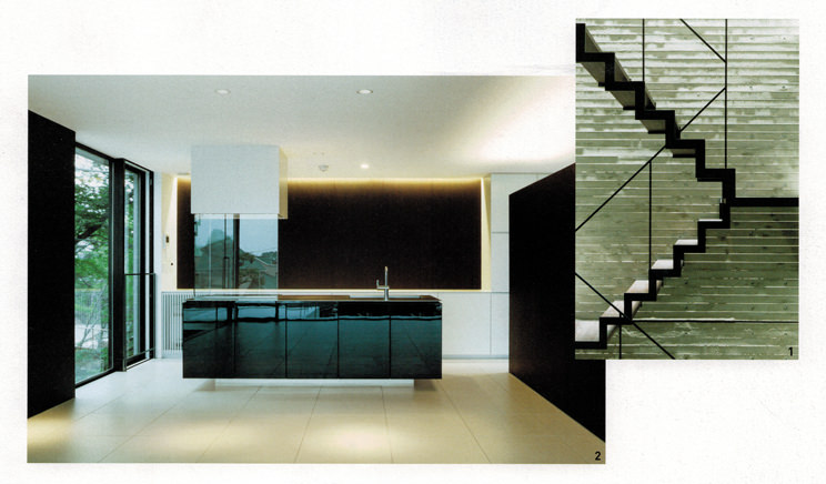 リネアタラーラによるオーダーメイドキッチン。箱の組み合わせで生じた「ずれ」により、窓を設けることができた明るい空間。調理の煙に配慮し、コンロにL字型のガラスを立てている。